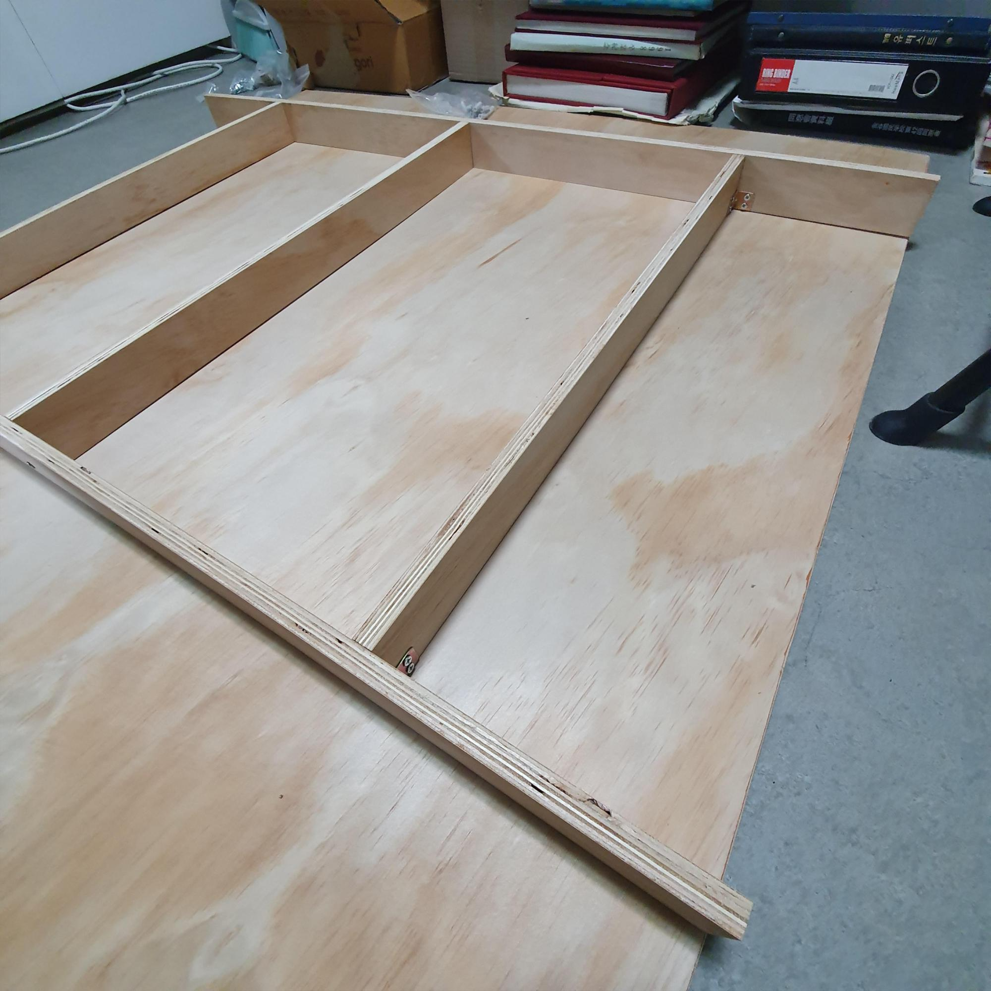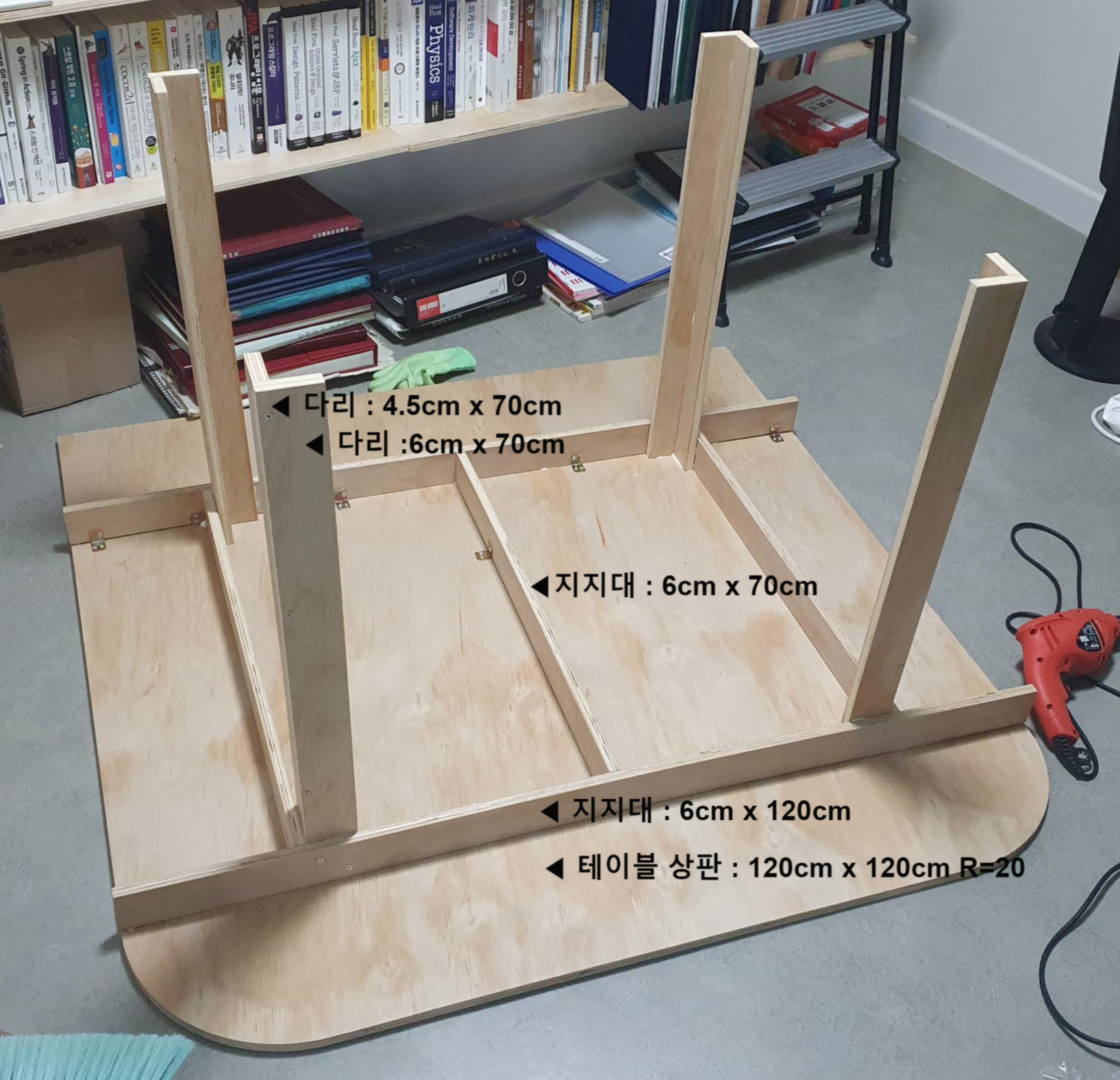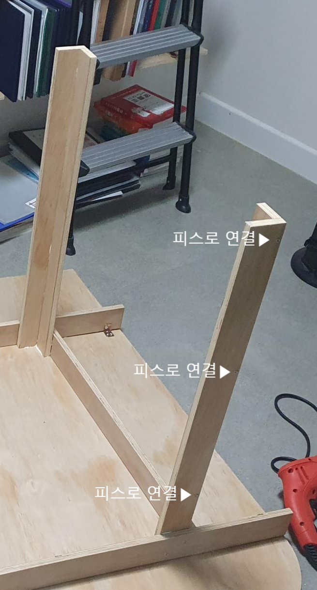 상판과 지지대 역할의 목재가 잘 고정이 되었다면 그 다음 순서로 다리를 만들어 주면 된다. 각재를 구입해 사용하면 그대로 박아 주면 되겠지만 나는 합판을 잘라서 다리를 만들어 줄것이기에 'ㄱ'자로 먼저 각각의 다리를 만들어 준다.