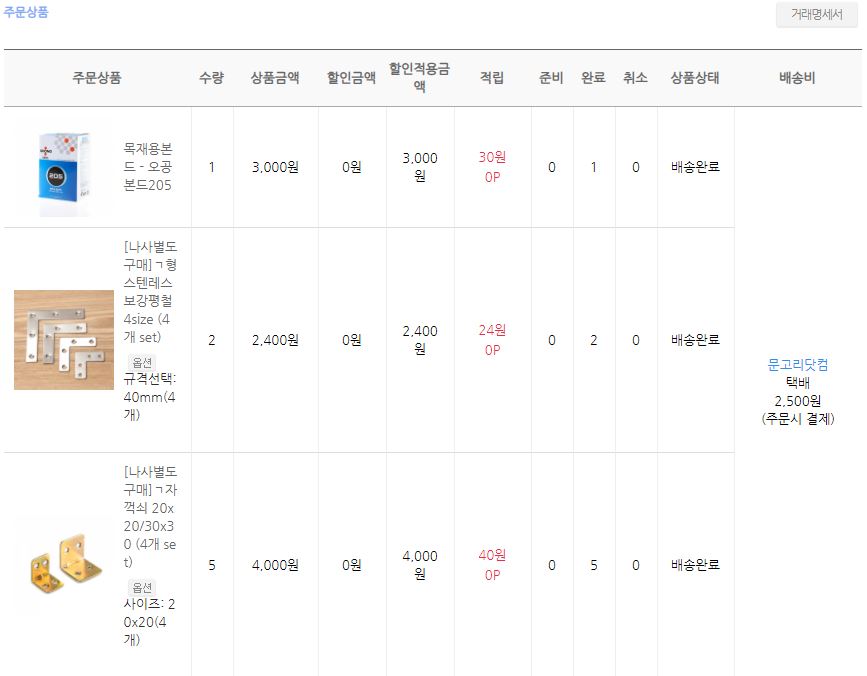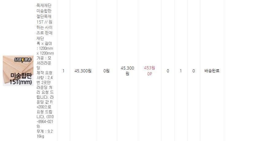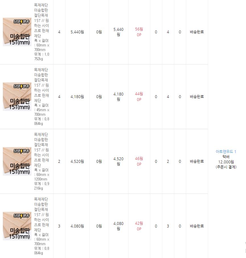 아래는 자세한 주문 목록이다. 목재 주문 규격과 수량을 볼 수 있다.