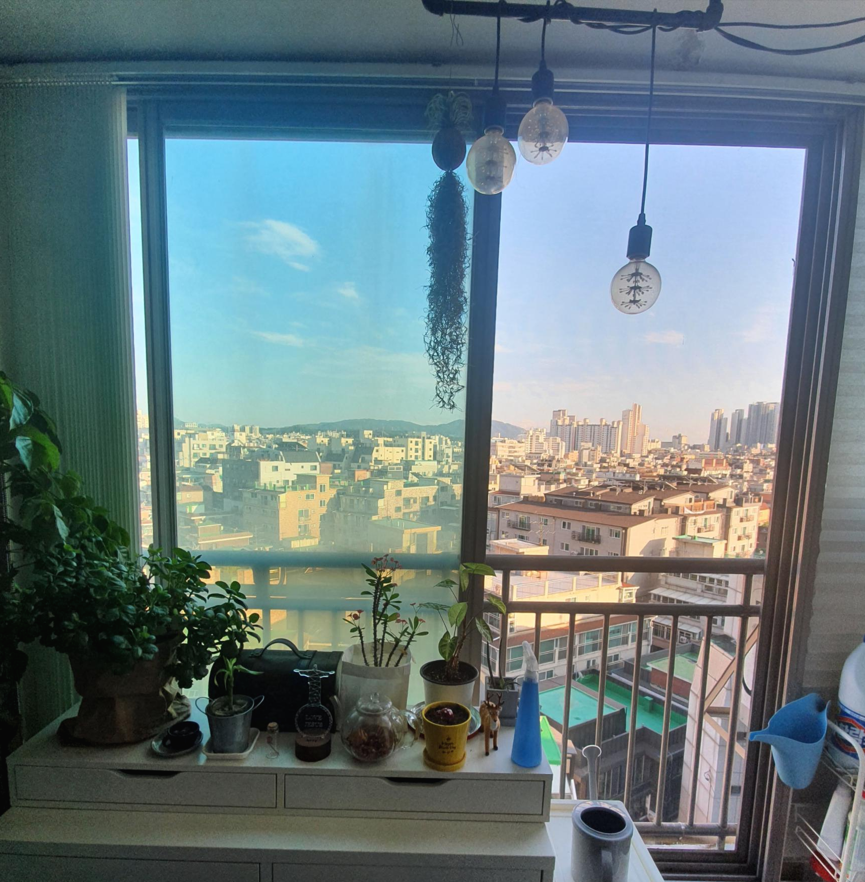 복도식 아파트기 때문에 사생활 보호를 위해 통창에는 미러필름도 넣어 달라고 주문 했다. 물론 해가 떨어지면 안이 훤히 들여다 보이기 때문에 커튼은 필수다. 재택중인 낮시간엔 활짝 걷어놓고 바깥 풍경을 바라볼 수 있다.